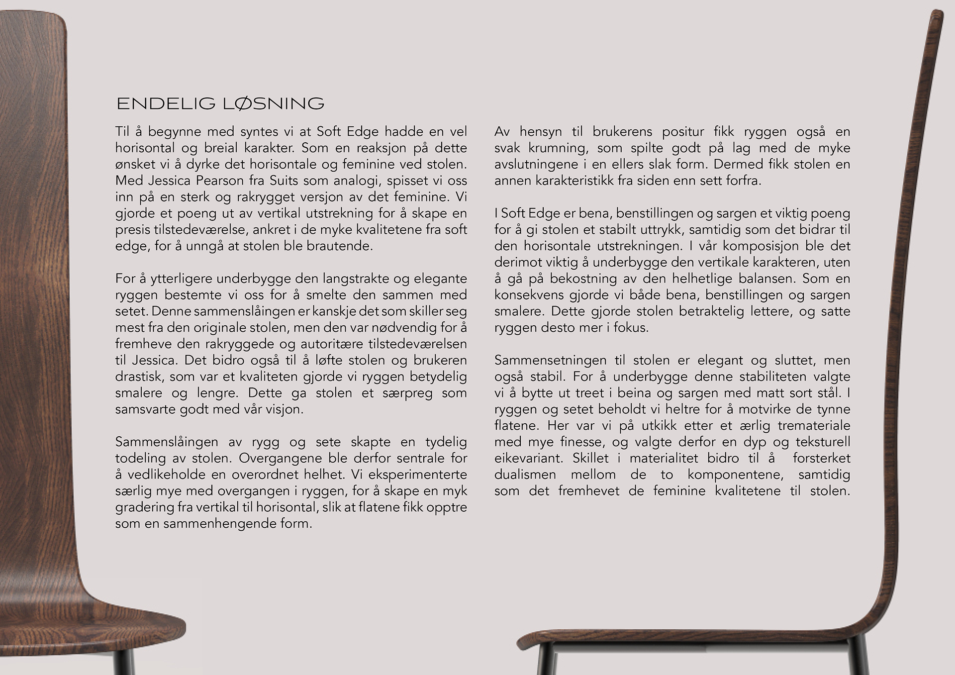 Redesign av HAY's ikoniske Soft Edge-stol. Semesterprosjekt i Estetikk 3 - Kompleks Komposisjon (TPD4113) høsten 2020, i samarbeid med Roselin Dawes og Einar Rosenhaug. Oppgaven var å analysere Soft Edge-stolen, identifisere hvordan dens ulike kvaliteter gir den karakter, og stegvis modifisere den mot en ny karakter. Vi opplevde at Soft Edge's tykkelse, benstilling og horisontale preg ga den et massivt, klønete og maskulint uttrykk. Som en motreaksjon ønsket vi å skape en streng, elegant og feminin stol, som personifiserer styrken og selvtilliten til den fiktive karakteren Jessica Pearson fra Suits. Innleveringen besto av 3D modeller og -printer av alle iterasjoner, forklaring av valgt karakter, begrunnelse av valg, og minst 2 fotorealistiske rendere.
